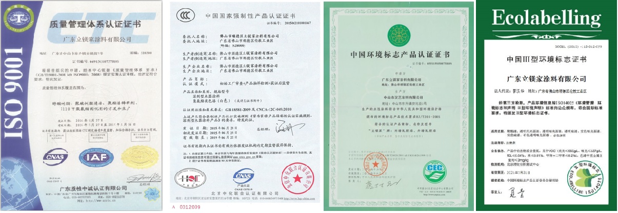 立鎂家的產(chǎn)品全面豐富:有藝術(shù)涂料、內(nèi)/外墻乳膠漆、仿石漆(真石漆、多彩漆_水包水_水包砂_陶彩砂_麻砂石、巖片漆、刮砂漆等)、防水涂料、特種涂料(氟碳漆、金屬漆、水性工業(yè)漆、水性器漆等)系列涂料;且產(chǎn)品全面通過(guò)“ISO9001國(guó)際質(zhì)量體系認(rèn)證”、“中國(guó)3C強(qiáng)制性認(rèn)證”、“中國(guó)環(huán)境標(biāo)志產(chǎn)品認(rèn)證”“中國(guó)III型環(huán)境標(biāo)志認(rèn)證”、“SGS檢測(cè)”等