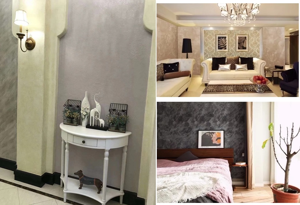 閃光石漆系列產(chǎn)品主要工程效果有:石層,立體花邊,亞麻布,生絲,浮雕等不同的裝飾效果。