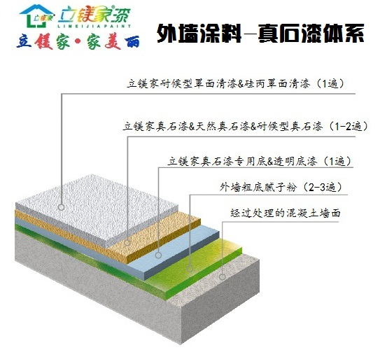 3、工藝流程:合格墻體→刮專用膩?zhàn)?遍→打磨,除塵→涂“立鎂家”外墻專用底漆1-2遍→涂“立鎂家”彈性中涂1遍(可選)→涂“立鎂家”天然真石漆1-2遍→涂“立鎂家”罩光面油1-2遍(可選)。