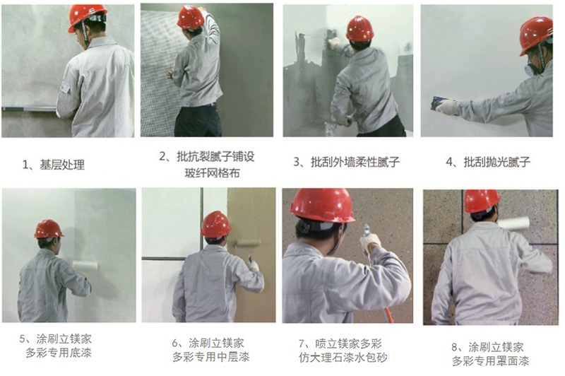 基層處理→貼網(wǎng)格布→貼陽角條→批刮抗裂砂漿膩?zhàn)?遍→外墻粗膩?zhàn)?-2遍→細(xì)膩?zhàn)?遍→(干透后)打磨→外墻膩?zhàn)羽B(yǎng)護(hù)→滾刷(噴)立鎂家仿石專用封閉抗堿滲透底漆1遍→描縫分格→滾刷(噴)立鎂家冠晶石專用實(shí)色中涂1-2遍→噴立鎂家冠晶石仿石漆1-2遍→拆分格線條紙、打磨線槽→(干透后)噴立鎂家荷葉自潔罩面光油2遍