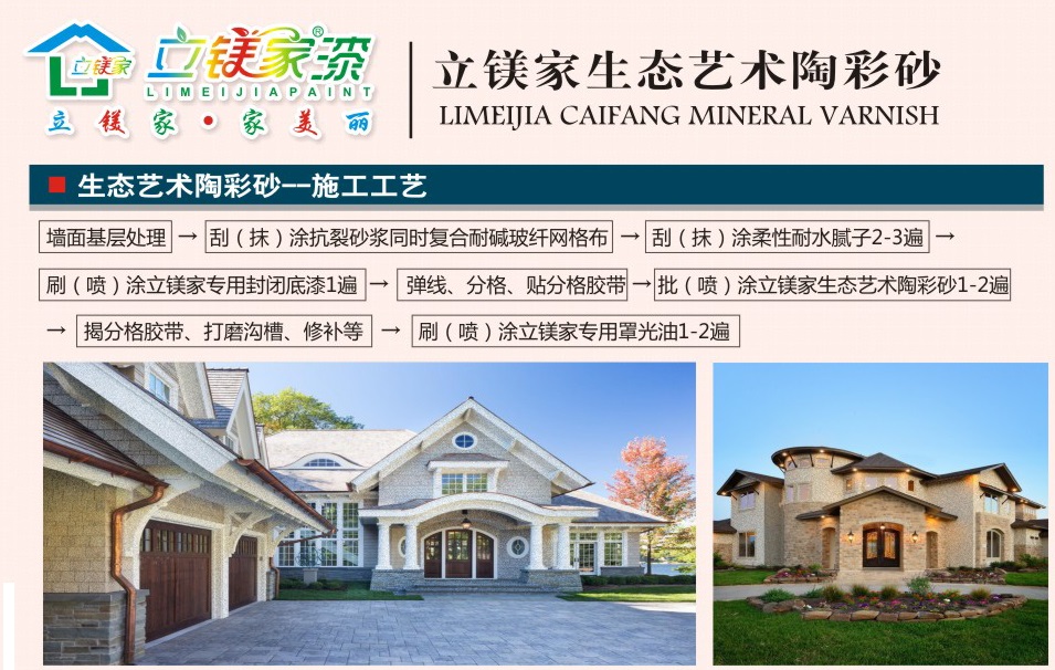 墻面基層處理 →刮(抹)涂抗裂砂漿同時復(fù)合耐堿玻纖網(wǎng)格布 →刮(抹)涂柔性耐水膩子2-3遍 →刷(噴)涂立鎂家專用封閉底漆1遍 → 彈線、分格、貼分格膠帶→批(噴)涂立鎂家生態(tài)藝術(shù)陶彩砂1-2遍→揭分格膠帶、打磨溝槽、修補(bǔ)等→刷(噴)涂立鎂家專用罩光油1-2遍