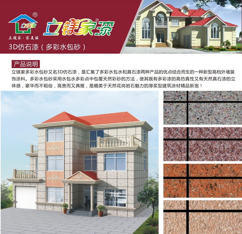 “立鎂家”外墻仿石漆之多彩仿大理石漆水包砂又稱3D仿石漆、荔枝面花崗巖漆,是匯集了多彩水包水和真石漆兩種產(chǎn)品的優(yōu)點結(jié)合而生的一種新型高檔外墻裝飾涂料。