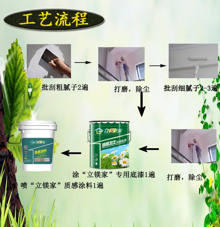 3、工藝流程:合格墻體→批刮粗膩?zhàn)?遍→打磨,除塵→批刮細(xì)膩?zhàn)?-3遍→打磨,除塵→涂“立鎂家”專用底漆1遍→涂“立鎂家”質(zhì)感刮砂漆1-2遍→批刮造型→涂“立鎂家”罩光面油1遍。