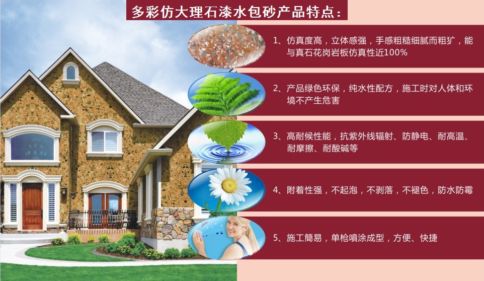 多彩仿石漆水包砂產(chǎn)品特點(diǎn):