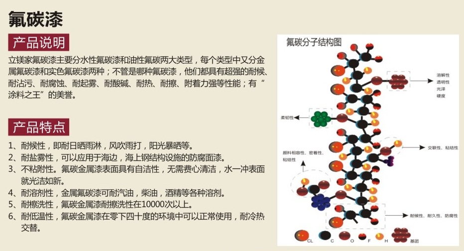 特種建筑涂料之金屬氟碳漆:在傳統(tǒng)丙烯酸酯和聚氨酯聚合特中引入含氟化合物取代氫原子,利用氟的諸多特征,如氟原子的電負性大、原子半徑小、形成的鍵長很短、鍵能很大、分子結(jié)構(gòu)穩(wěn)定、涂層低表面能等特征。金屬氟碳漆具有極好的耐候性、耐鹽害性、耐熱性、耐腐蝕、耐化學品侵蝕、環(huán)境破壞、表面自潔等性能;同時能超久保護涂層不褪色、不起霜、不龜裂、不粉化、不銹蝕等各種不利因素,而避免建筑結(jié)構(gòu)遭受損害,長久完美如新。