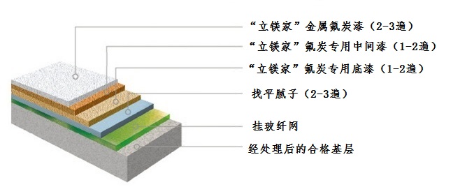 墻面基層處理 →刮(抹)涂抗裂砂漿同時復(fù)合耐堿玻纖網(wǎng)格布 →刮(抹)涂柔性耐水膩子2-3遍 →刷(噴)涂立鎂家專用封閉底漆1遍 → 彈線、分格、貼膠帶→刷(噴)涂立鎂家中間漆1-2遍→刷(噴)涂立鎂家金屬氟碳漆2-3遍
